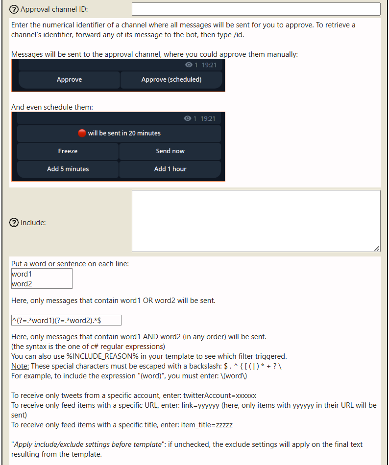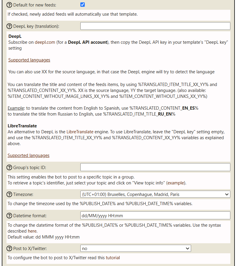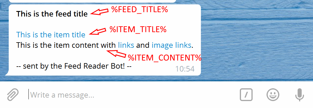 You can see that the bot variables, like %FEED_TITLE%, %ITEM_CONTENT% etc. have been replaced with their matching values.