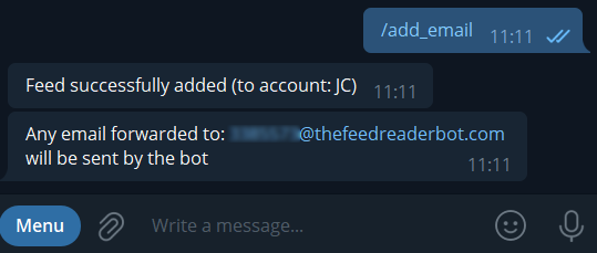This command creates an email address @thefeedreaderbot.com, and add the "Email feed" to your account, so now, any email sent to this address will be sent by the bot on Telegram.