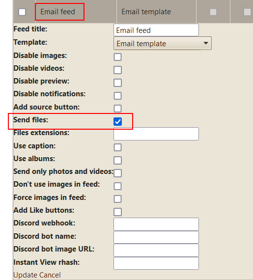 To receive the files attached to your emails, just check "send files" in the feed's settings: