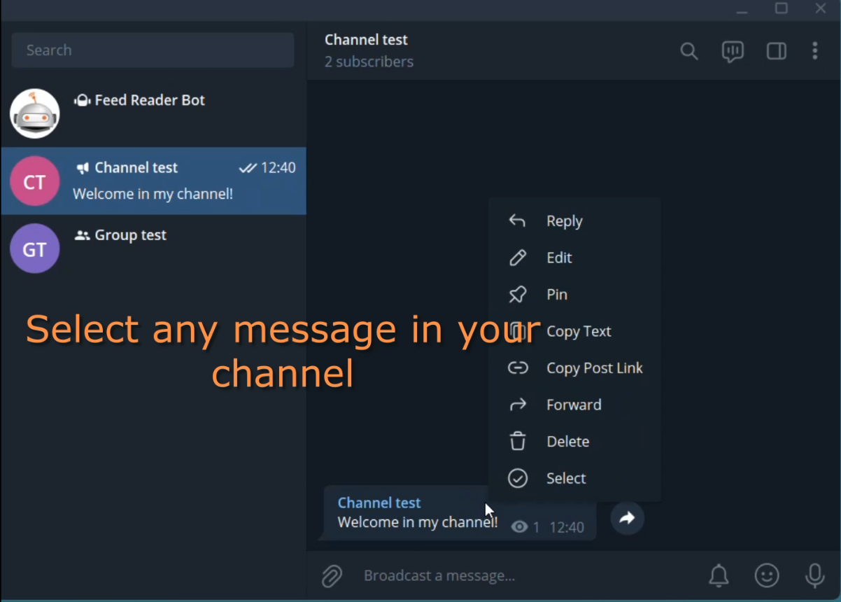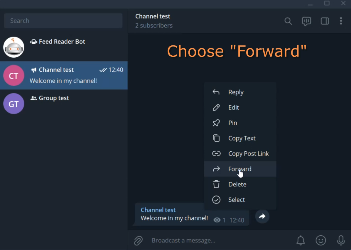 Transfer any message from your channel to the bot, and the configuration will be done.