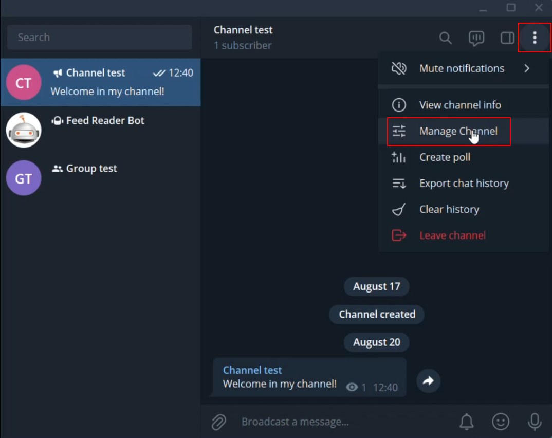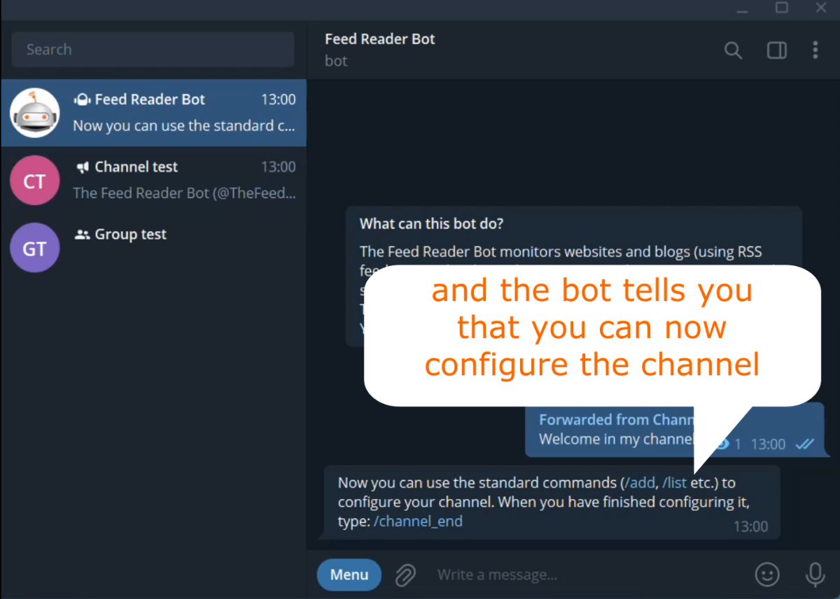 Now, all commands send to the bot will apply to your channel. So you can add feed subscriptions using /add, remove them using /remove, see the list of subscriptions using /list etc.