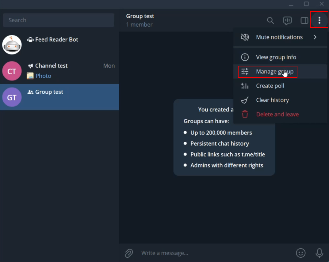 Now, all commands send to the bot will apply to your group. So you can add feed subscriptions using /add, remove them using /remove, see the list of subscriptions using /list etc.