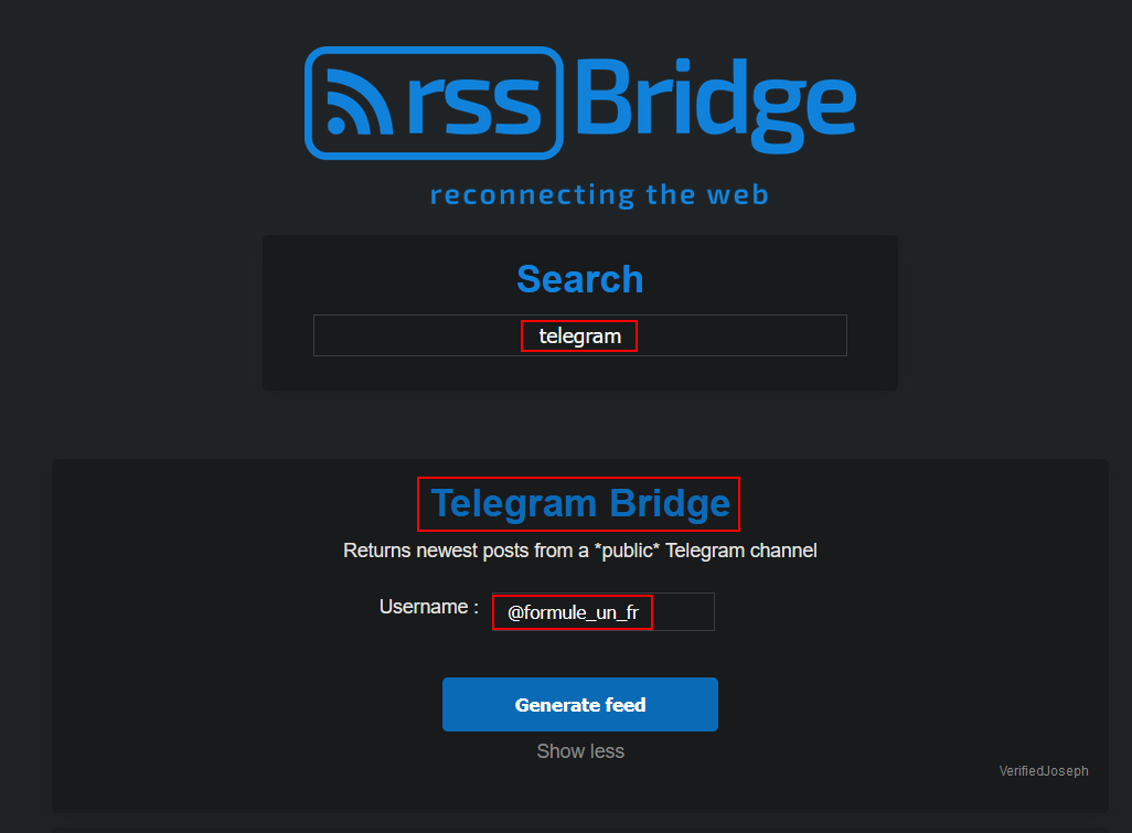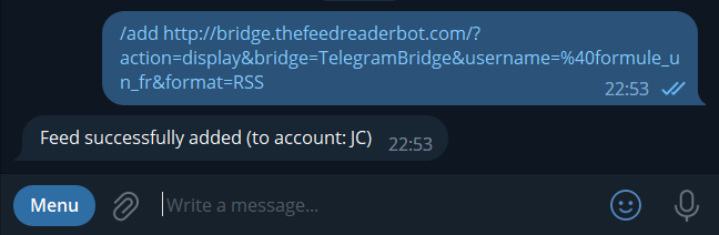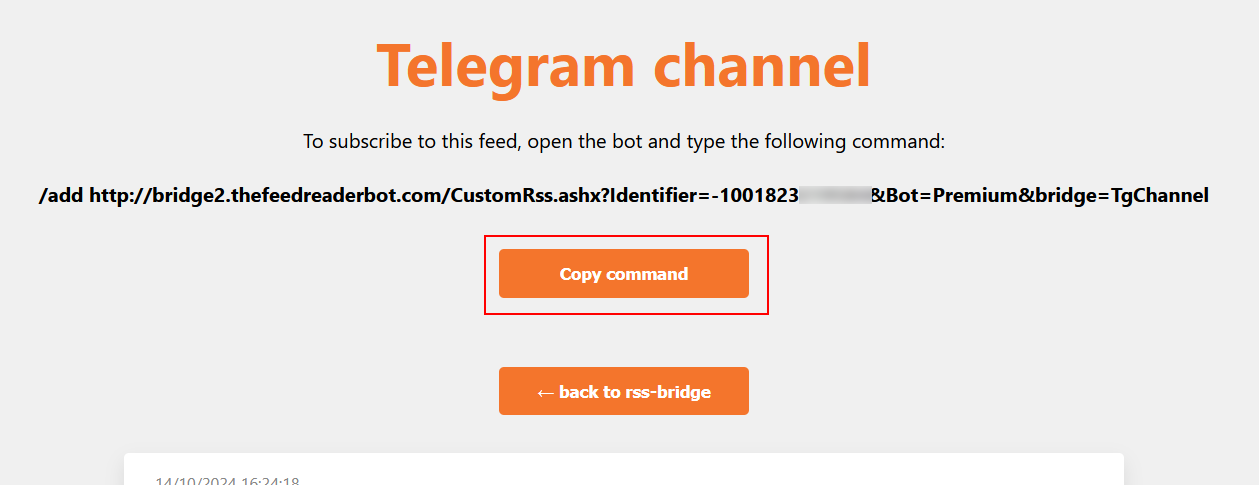 https://bridge2.thefeedreaderbot.com, scroll down to the "Telegram channel" bridge, and enter your channel's identifier, and select if you're a premium or elite subscriber: